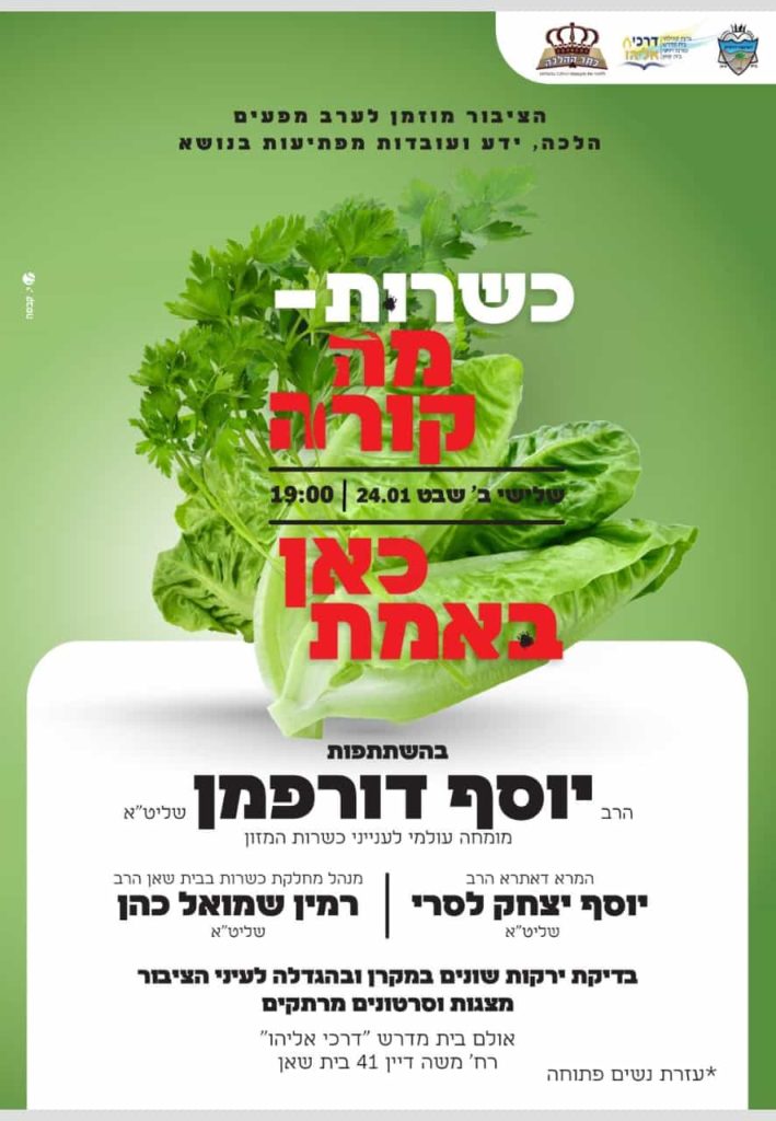 התכנסנו ביום שלישי בערב לכנס בנושא חרקים, לומדי קורס משגיחי כשרות, משגיחי כשרות וסתם הרצאה עמך ישראל, לשמוע הרצאה מרתקת מפי הרב יוסף דורפמן שליט"א. ההרצאה העשירה בפרטים לוותה במצגת ובסרטונים מרחבי העולם.